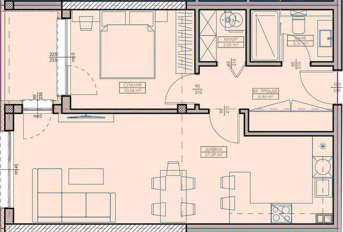 Апартамент – Дневна с кухненски бокс, спалня, баня с тоалетна, килер, входно преддверие и лоджия
